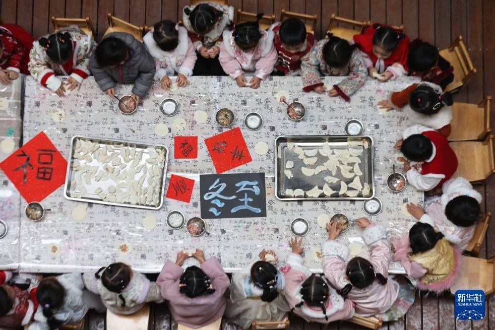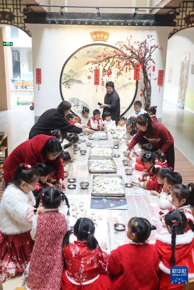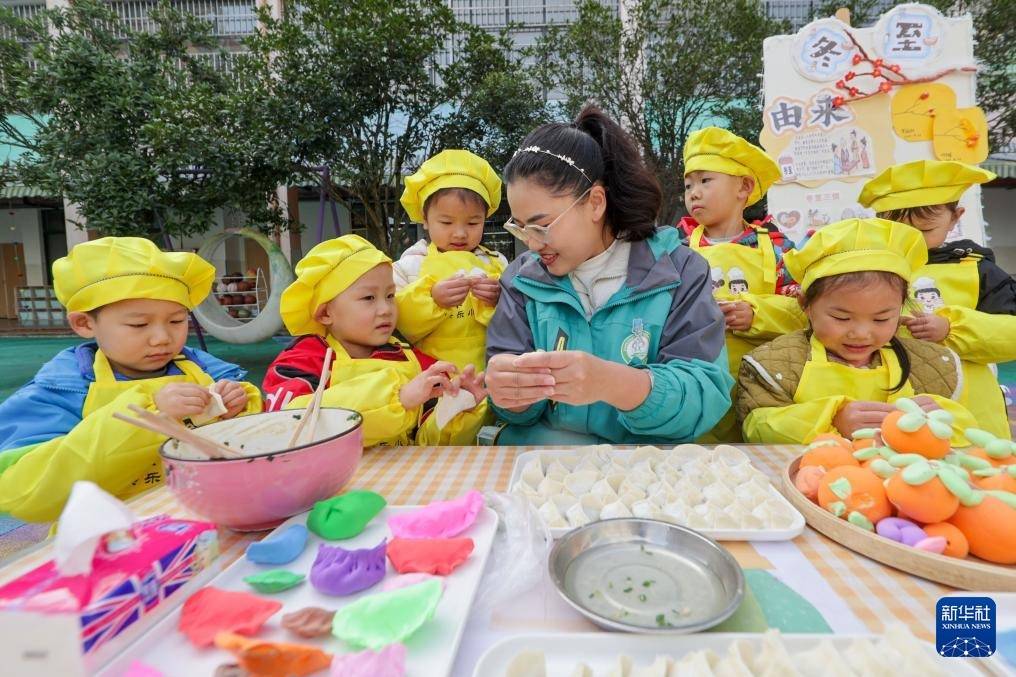 12月18日,浙江省湖州市德清县乾元镇第一幼儿园小朋友在包饺子。